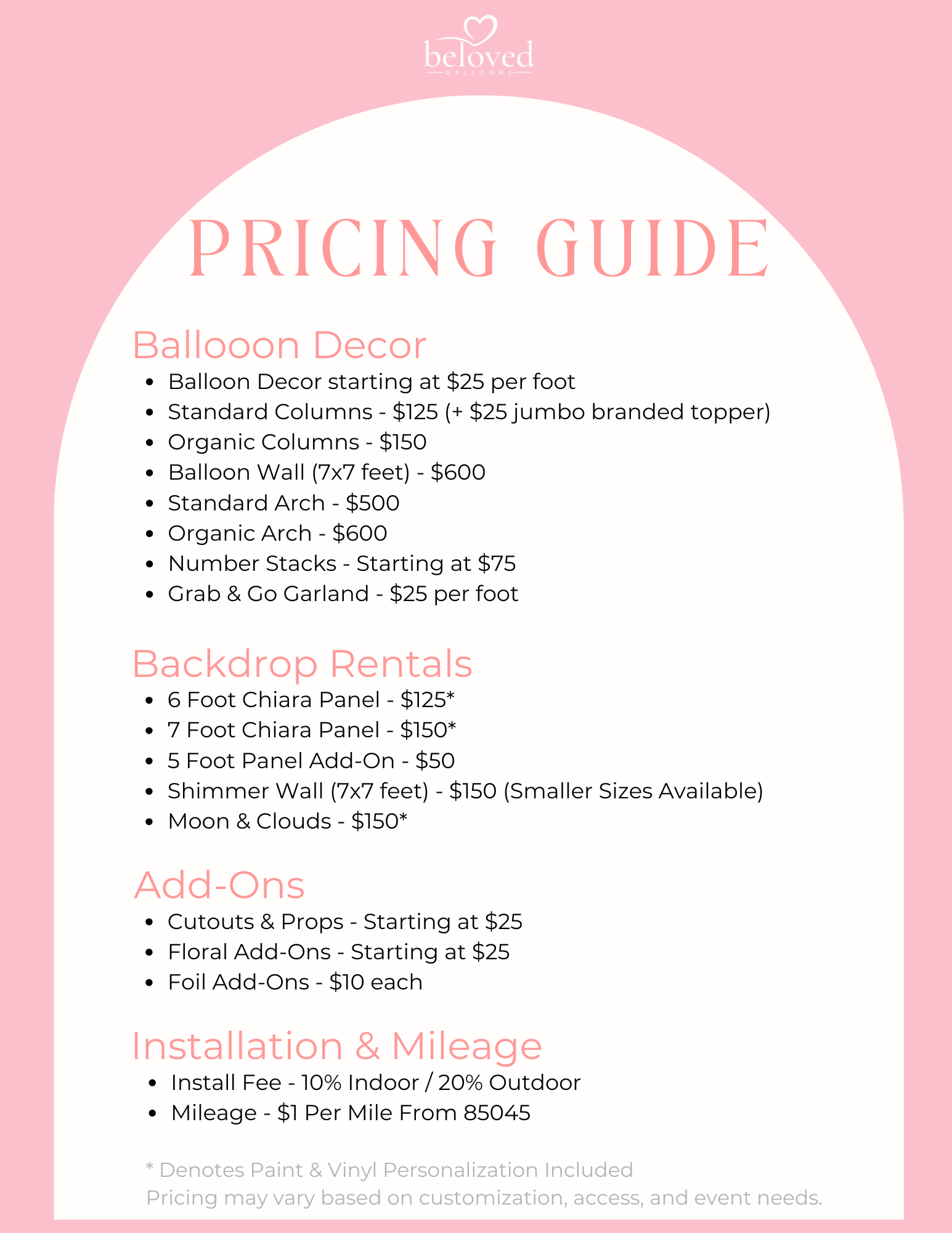 Our custom installations include columns, arches, freestanding garlands, balloon walls, and decor attached to any surface. We can also incorporate florals, props, and custom signage to seamlessly match your theme, style, and vision.